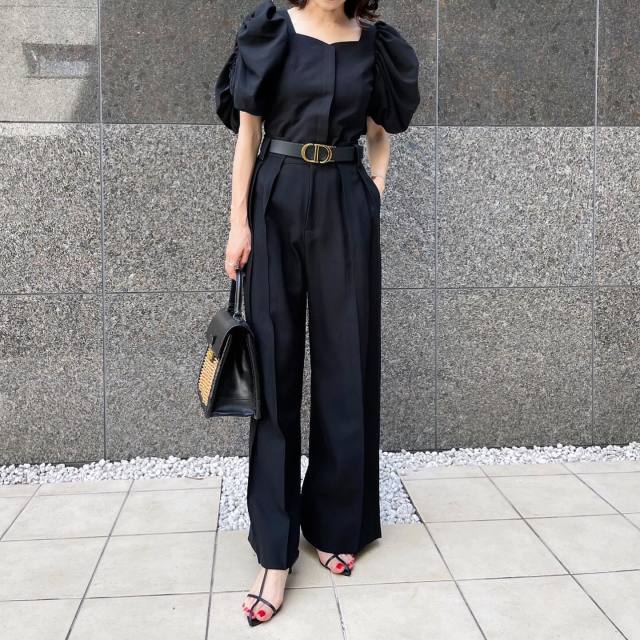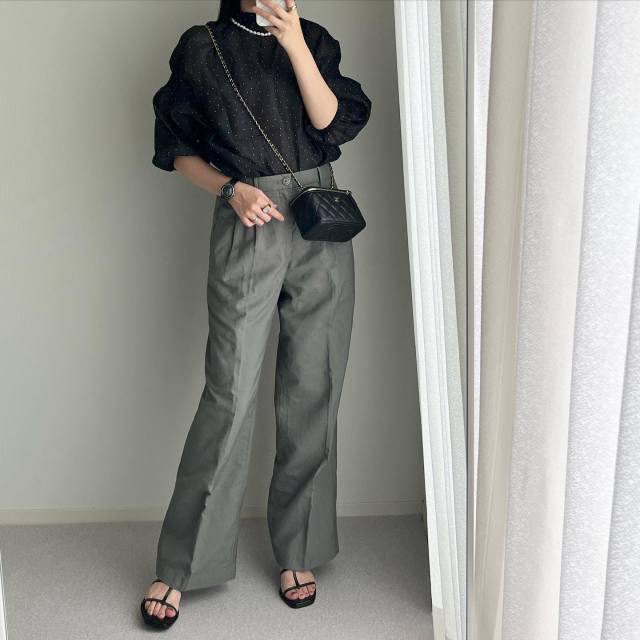 ダークな黒ブラウスは「ワイドパンツ」を穿くときにうってつけ。収縮色のブラウスがダボッとしたシルエットのパンツを引き締め、シックな装いに決まります。