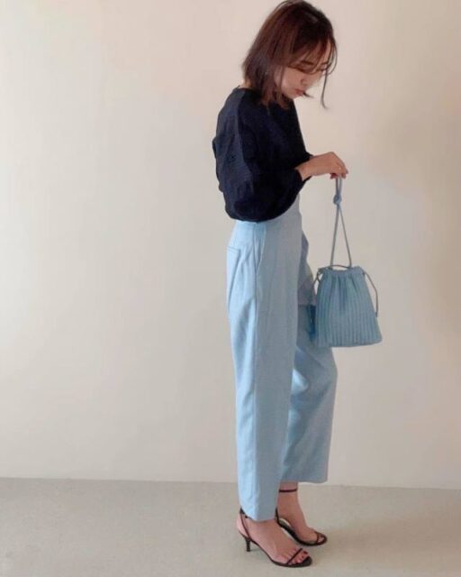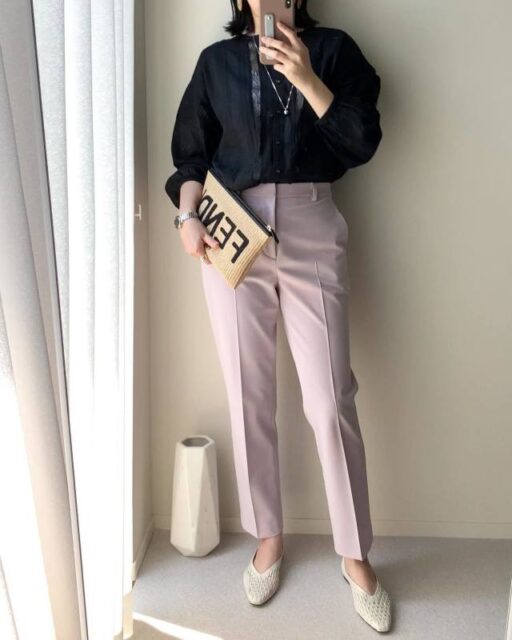 女性らしく着こなしたいときは「ペールトーンのきれい色パンツ」がイチ押し。淡いカラーパンツがフェミニンなムードを添えて、コーデを柔らかな印象に。一方で黒ブラウスのおかげで甘いパンツが落ち着き、大人っぽく決まります。
