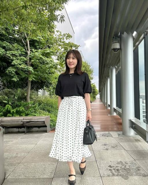 半袖の黒ブラウスにハマるのが上品な「マーメイドスカート・フレアスカート」。短い袖のブラウスが軽やかなのでボリューミーなスカートにもってこい。夏の通勤コーデにもおすすめの組み合わせです。