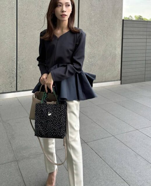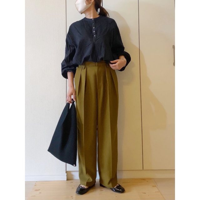 立体的なシルエットのパンツのおかげで、きちんとした印象に。淡い基本色で取り入れると黒ブラウスに映え、コーデがきれいめにまとまります。
