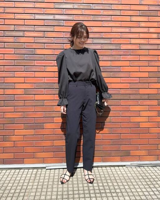 おしゃれに見える!と人気なのが「黒パンツ」と黒ブラウスの組み合わせ。このとき全身黒のスタイリングがのっぺり見えないよう、黒ブラウスはデザインにひとくせあるものを選びましょう。上半身に視線が集まり、コーデバランスが整います。縦長シルエットを強調するのでスタイルアップも狙えますよ。