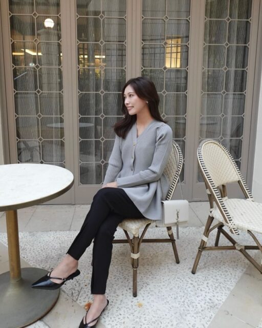 カーディガンのボタンを全留めして着こなすのがコツ。シンプルなパンツに合わせるだけでサマになりますよ。
