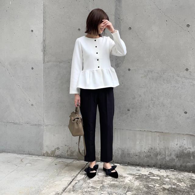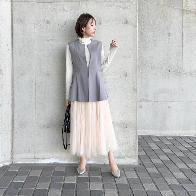 メンズライクになりがちな「ベスト・ジレ」ですが、ペプラムデザインならグッと女性らしい雰囲気に。下に着るトップスはぴったりとしたシルエットをチョイス。ベスト・ジレの立体的なシルエットが引き立ち、今どきのルックスに決まりますよ。