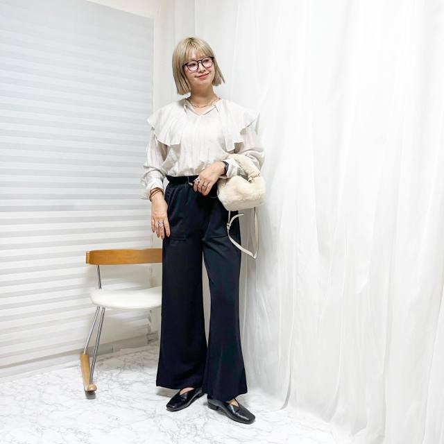フリルブラウス×黒パンツのコーデ