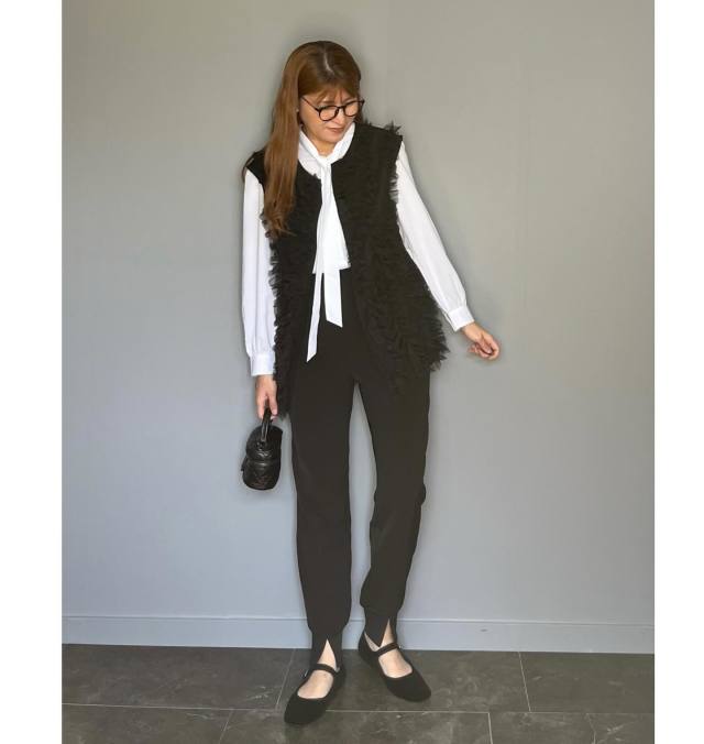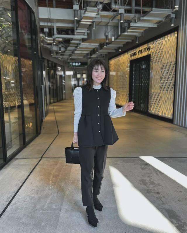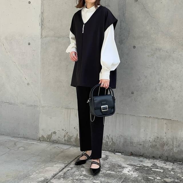 ブラウス×黒パンツ×ベストのコーデ