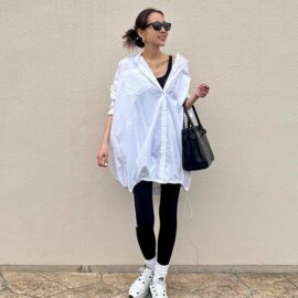 ここにゆるっとしたメンズライクなトップスを合わせれば、ラフなのに計算されたバランスが完成。レギンスに白ソックスを重ねてチラリと覗かせると、おしゃれ度がさらにアップしますよ。