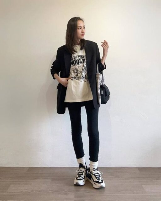 スポーティなレギンスコーデをグッと今っぽく格上げしてくれるのが存在感のあるハイテクスニーカー。ラフに見せながらも洗練されたムードを漂わせます。ロング丈ジャケットを羽織ると都会的なきれいめカジュアルに。