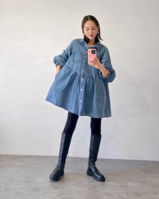 レギンスとロングブーツの組み合わせは脚のラインを美しく整えながら脚長効果も狙える優秀ペア。スナップではタイツを着用していますが、レギンスに替えても効果はそのまま。ミニ丈ワンピースを合わせれば、今っぽく鮮度あるスタイリングに決まります。