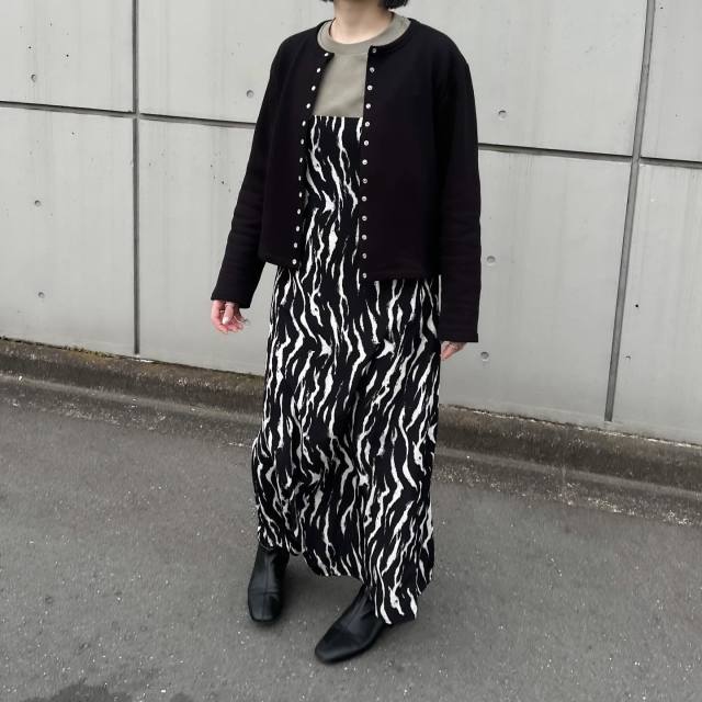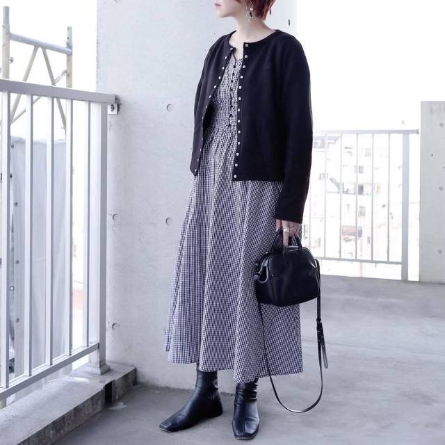 ワンピースに羽織れば黒カーディガンをよそ行きに使えますよ。ワンピースはどんな色味でもOKですが、特におすすめなのが「総柄ワンピース」。シンプルなデザイン&大人色を兼ね備えた黒カーディガンは、お目立ちなワンピースにうってつけ。インパクトの強いワンピースに映え、大人っぽいコーデを演出します。