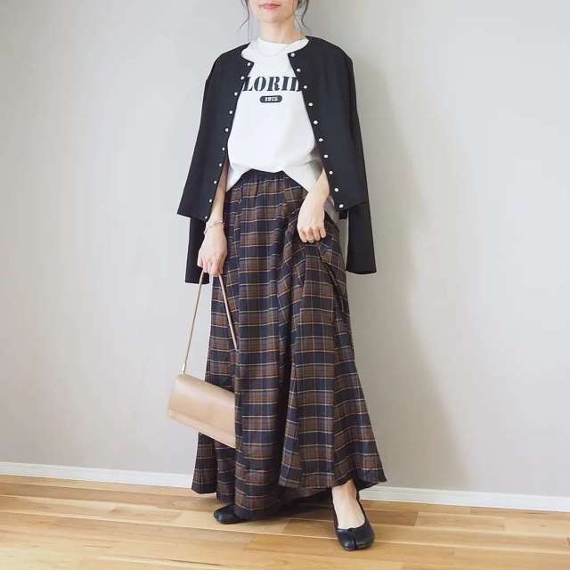 合わせるボトムは濃色のロングスカートやワイドパンツがおすすめ。これなら白Tシャツが季節外れに見えず、秋らしいシックなコーデが完成します。