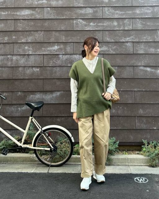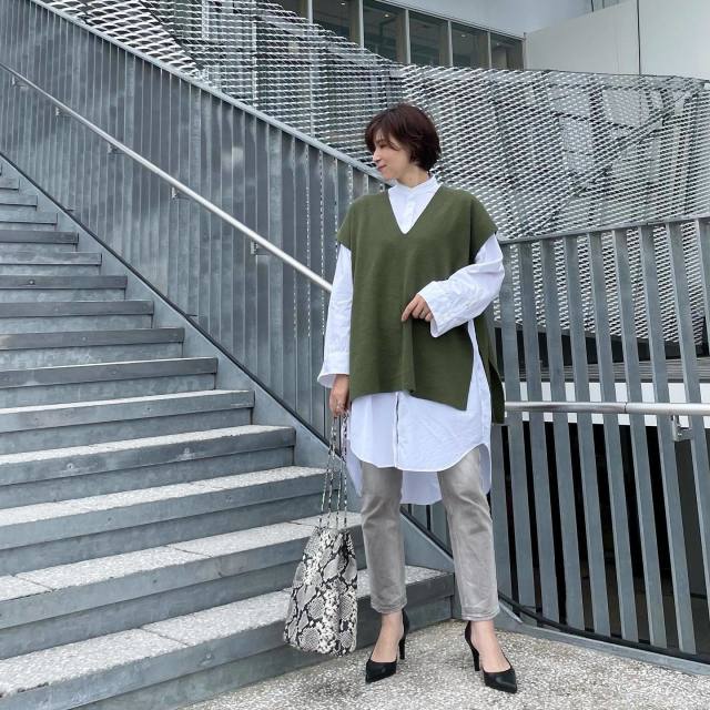 秋にちょうどいいのが「Vネックベスト」と白シャツの重ね着。ニットとシャツのレイヤードコーデはほっこりしがちですが、Vネックのおかげでシャープな雰囲気が加わりスッキリ見え。50代にはパンツと合わせるハンサムなスタイリングが馴染みますよ。
