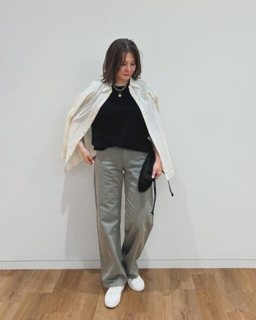 例えばスナップのようなスタンドカラーやアシンメトリーデザインの白シャツなら、着るだけでコーデの鮮度アップ。ダークカラーのパンツと合わせるとスタイリッシュに仕上がりますよ。