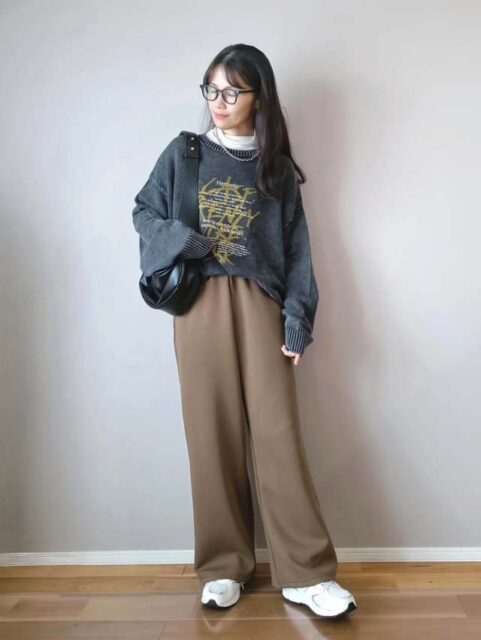 楽ちんな着心地とエフォートレスなムードを兼ね備えたゆるパンツはこの秋も頼れる存在。UNIQLO(ユニクロ)のスウェットパンツは色違いで揃えたくなる優秀ボトムです。ロゴ入りトップスを合わせれば、着映えるキャッチーなスタイリングが完成。