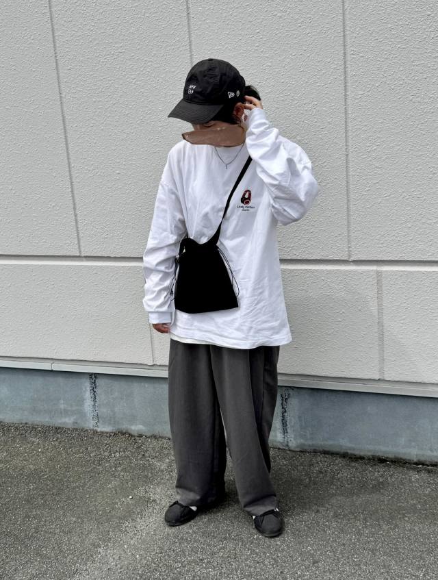 ワイドパンツを合わせたリラクシーカジュアルを楽しむなら、ウエストインせずゆったり感を楽しむのもおすすめです。シルエットのメリハリが出ないので、ショルダーバッグなどでアクセントをつけると◎。