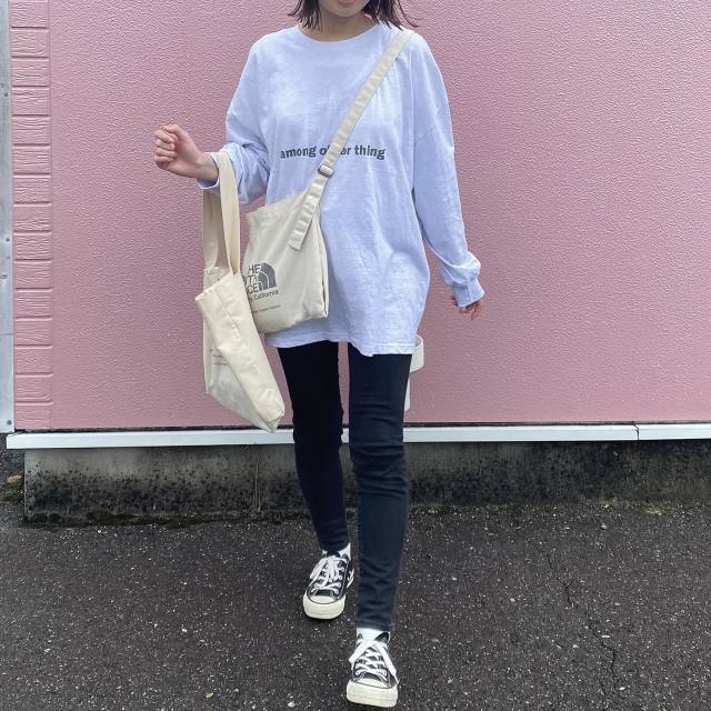よりすっきりメリハリのあるシルエットを目指すなら、ロンT(長袖Tシャツ)×スキニーパンツの組み合わせがイチ押しです。定番のカジュアルスタイルなので、サッと合わせるだけでコーデが決まるのが嬉しい!