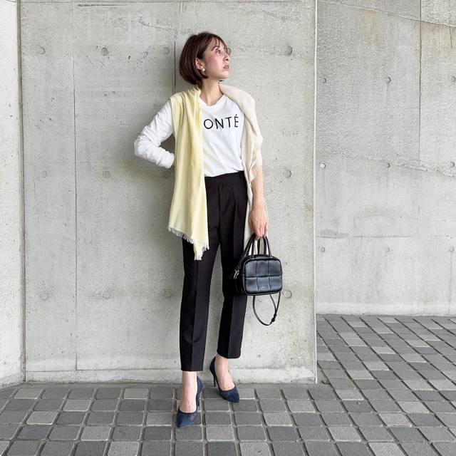 ストレートやテーパードパンツは、ロンTをきれいめコーデに仕上げるときにも役立つアイテム。カジュアルなロゴ入りロンTも、すっきり上品なパンツを合わせることでオフィスもOKなスタイリングに変身!