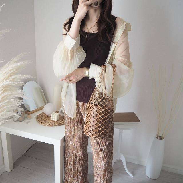 同じく暑い時期の羽織りものとして使えるシアーカーディガン。程よく風を通してくれるので、日焼け対策としても役立ちます。