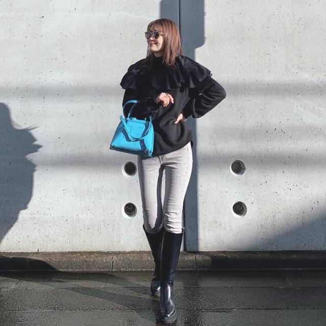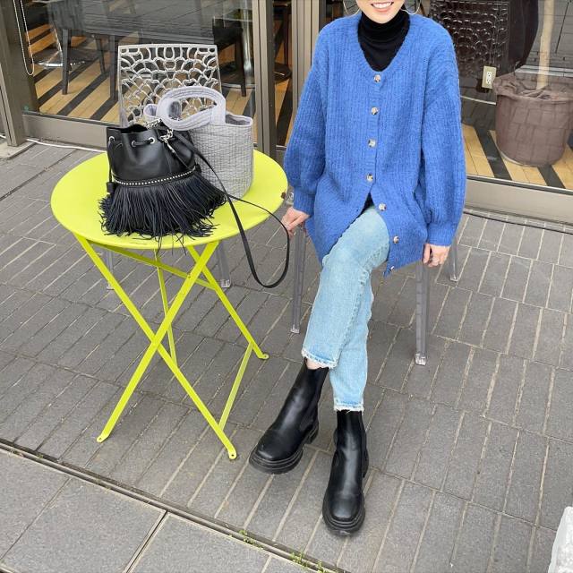 【40代×秋のデニムパンツコーデ】スキニーデニム×ロングブーツで脚長見え