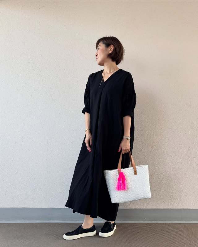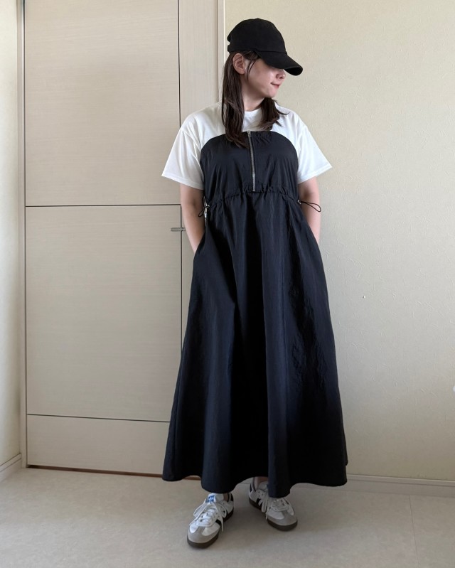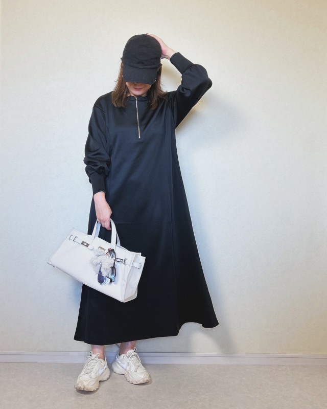 ブラックやネイビーなどの濃色ワンピースには、白スニーカーを合わせて足元に抜け感を作るのがおすすめのスタイリング術。このとき選ぶスニーカーのシルエットによっても、ガラリと印象が変わりますよ。