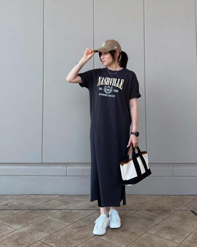 最後にご紹介するのは、ロゴ入りワンピースと白スニーカーの組み合わせ。親しみやすいカジュアルなワンピースは、白スニーカーで足元に清潔感を漂わせると品のよさも演出できますよ。春夏はTシャツワンピース、秋冬はニットワンピースやスウェットワンピースなど、通年で楽しめるおすすめコーデバランスです。