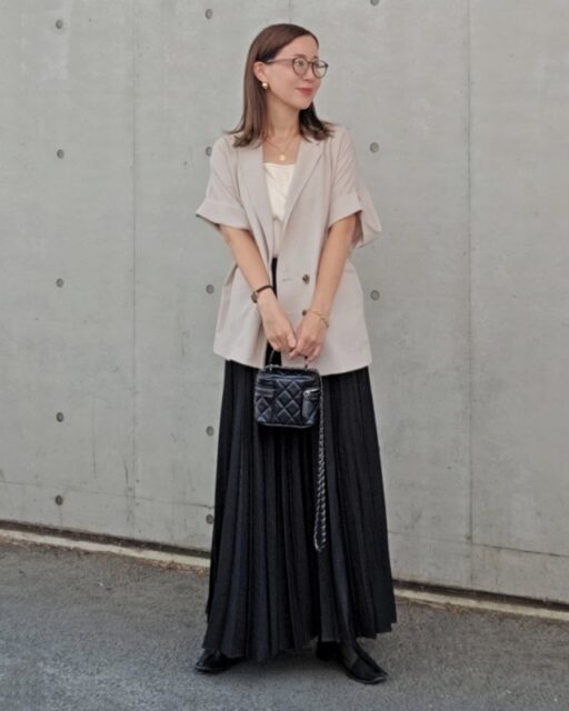 プリーツスカートは「テーラードジャケット」と相性バツグン。カッチリとしたアウターとスカートの組み合わせとなるため、インナーはカジュアルなものを選びましょう。これならコーデが堅苦しく見えず、今どきのルックスに決まりますよ。