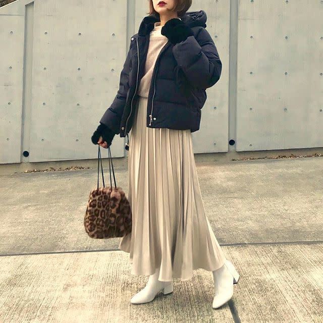 もこもこのダウンジャケットを羽織るときにうってつけなのが「淡色のプリーツスカート」。白やベージュのプリーツスカートならコーデに軽やかさが加わり、ダウンジャケットの着膨れ感を払拭できます。さらにカジュアルなダウンをきれいめに着こなせるなど、実はいいことずくめのテクニックです。