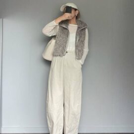 お出かけモードを演出するのが「ボリューミーなファーベスト」。2025秋冬は毛足が長いタイプが流行りです。シンプルなトップスに映え、羽織るだけでコーデがサマに。