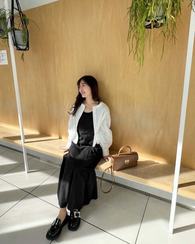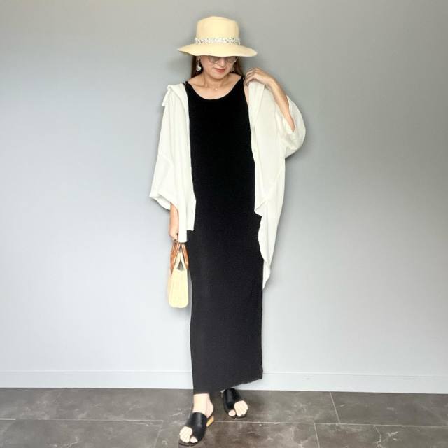 黒ワンピース×白シャツコーデ