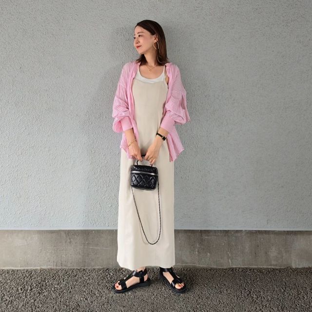 こちらのスナップでは、ライトベージュのワンピースにピンクのシャツをON。このような淡色ワンピース×華やかシャツコーデは、明るい色でパッと目を惹くスタイリングに仕上がります。「全体のシルエットが決まらないな……」というときは、袖をサッとまくり上げて抜け感をプラスするのもおすすめです。