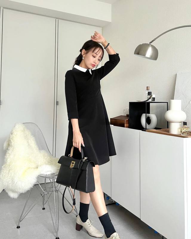 黒のミニワンピースコーデにベージュ靴を合わせる上品スタイルもおすすめです。スナップではドレスシューズを投入して、ミニワンピースコーデをキリッときれいめに。黒ソックスを使うと、ワンピースと靴の間のバランスを取りやすいですよ。