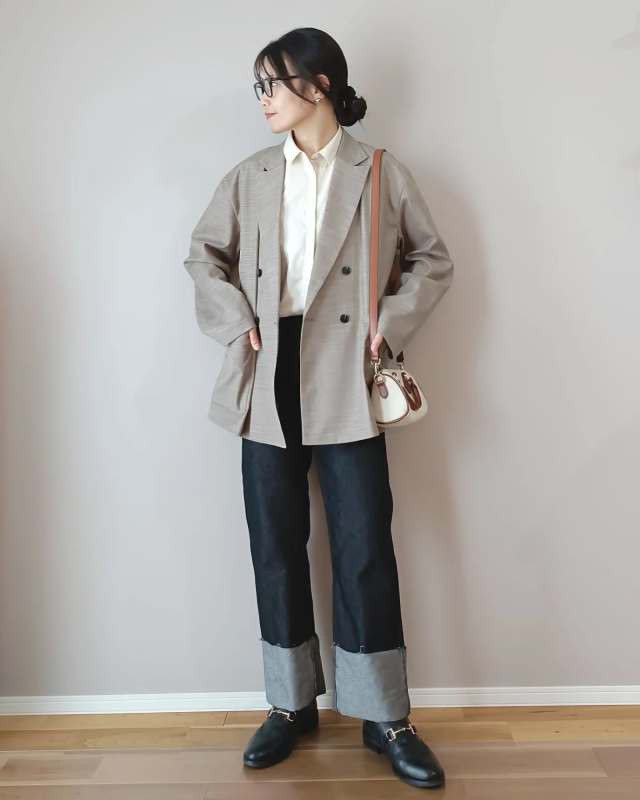 まずご紹介するのは、白シャツ×ショート丈アウターの組み合わせ。ショート丈アウターから白シャツをチラッと見せると、コーデが軽やかに見えますよ。この組み合わせはアウターの形次第でカジュアルにもきれいめにも振れるので、いろんなバリエーションで着回しやすいバランスです。