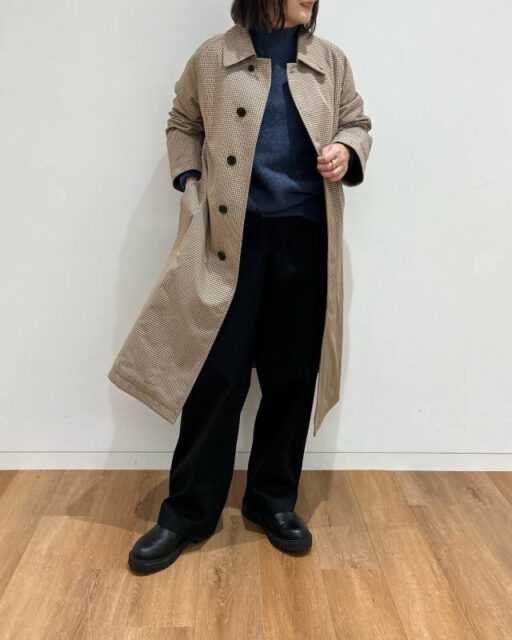 初冬にイチ押しなのが「トレンチコート」との着合わせ。トレンチコートは王道のベージュ色をはじめ、クラシカルなチェック柄にもぴったりマッチします。カッチリしたアウターと黒ズボンの合わせ技で大人っぽい着こなしに。