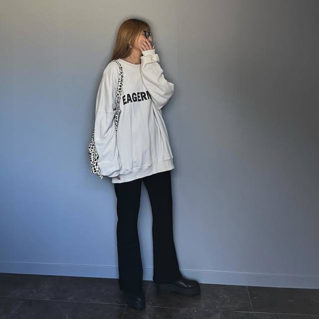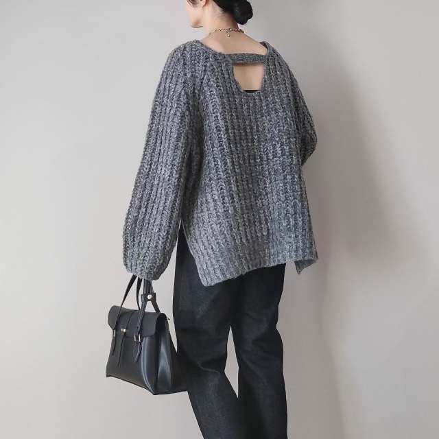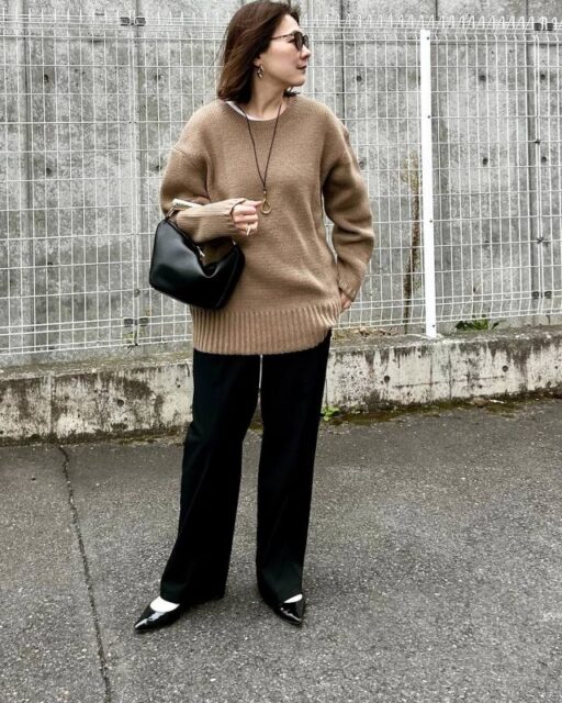 冬の黒ズボンは「ニット」と相性バツグン。ニットであれば多くのデザインに似合いますが、黒ズボンの本領が発揮されるのはゆったりニットと合わせたとき。収縮色のズボンがオーバーサイズのニットを引き締めて、ダラしなく見えるのを解消します。