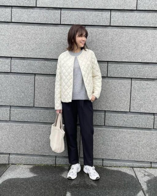 黒ズボンに合わせるアウター選びに迷ったら「白」をチョイス。クリーンな色味のアウターが引き立ち、コーデのメリハリがアップ。全身にパキッとしたコントラストが生まれ、黒ズボンをスッキリ着こなせますよ。