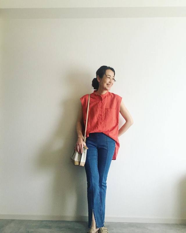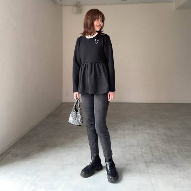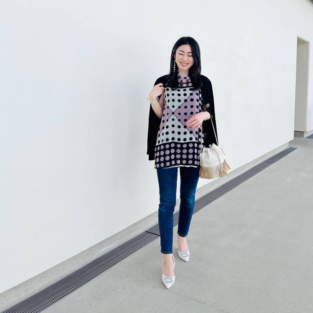 スキニージーンズ×長め丈ブラウスのきれいめコーデ