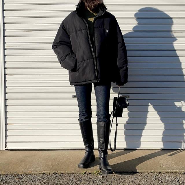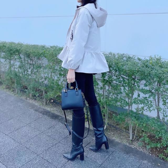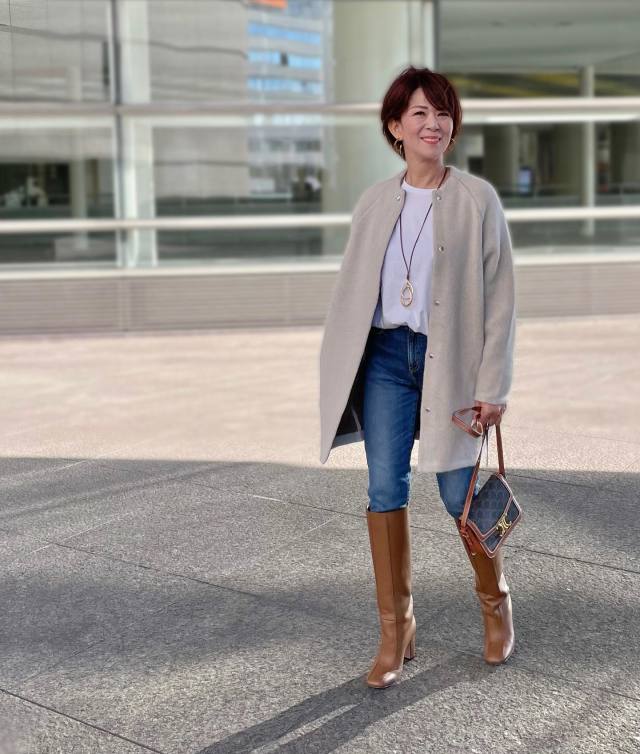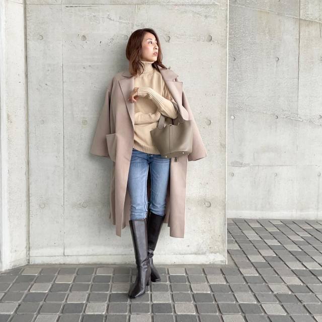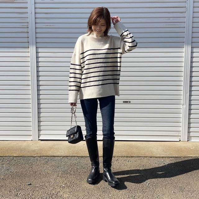 スキニージーンズ×ロングブーツのすっきり脚長コーデ