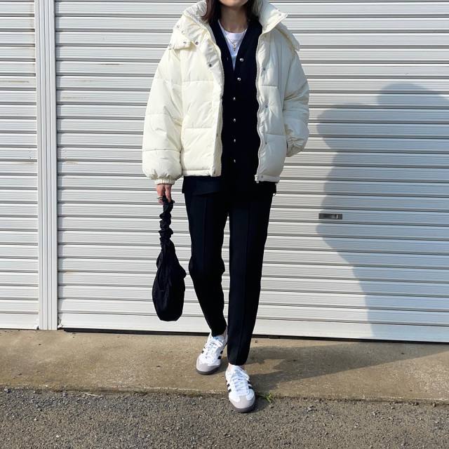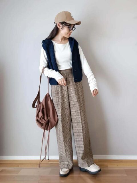 長袖のアウターを羽織るほどでもない時期におすすめなのが「ニットベスト・ファーベスト×ロンT(長袖Tシャツ)」の重ね着コーデ。特にぴったりめのロンTはうってつけです。下に着たロンTがボリューミーなべストを引き締め、コーデの着膨れ感を解消します。