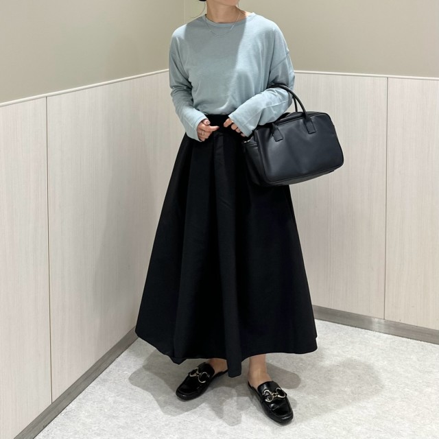 せっかくのママ会だから、着映えるスカートを主役にしたスタイルもおすすめ。くすみブルーのトップス×黒スカートのシンプルな組み合わせでも、スカートにデザイン性があれば華やぎのある印象に。クラシカルなバッグや靴をプラスして品のよさを添えればパーフェクトです。