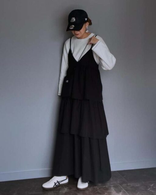 ボリュームのある黒のティアードワンピースは、白ニットをインしてカジュアルダウン。黒キャップと白スニーカーでスポーティなエッセンスを加えると、今っぽいエフォートレスコーデが完成します。甘さと軽さのバランスが絶妙なデイリーに取り入れたい着こなしです。