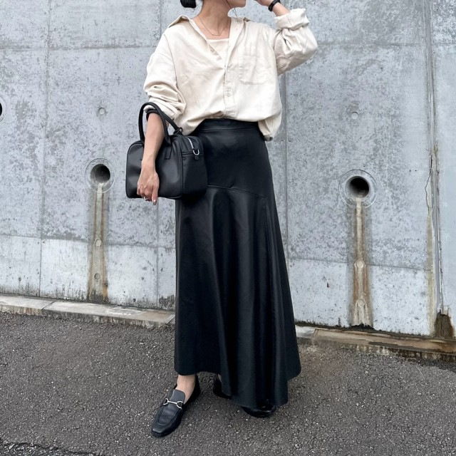 今季らしいモノトーンコーデに仕上げてくれるのが、程よくエッジを効かせてくれるレザー素材のアイテム。オフホワイトのシャツに黒のレザーロングスカートを合わせれば、配色はベーシックでもどこかモードな雰囲気に。レザーの強い印象が、シャツの柔らかな色味と質感でマイルドに見えるのもメリットです。