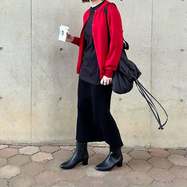 特にスナップのように上下を黒で統一するコーデはスッキリとした印象に。オールブラックにカラーカーディガンが映え、おしゃれに決まりますよ。