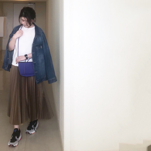 ロングスカートをラフに着こなしたいときは「デニムジャケット」が最適。カッチリしたシルエットのため長いスカートがバランスよく収まり、大人っぽいカジュアルコーデに。Tシャツとスニーカーを合わせるとより馴染みますよ。