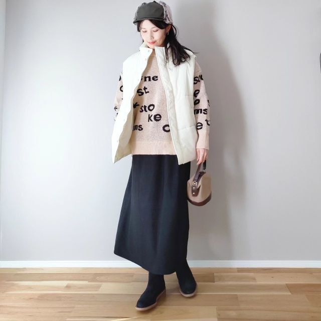 冬シーズンのロングスカートコーデにハマるのが「ファーベスト・ダウンベスト」。もこもことしたファーやダウン生地のボリューム感がロングスカートになじみ、今どきのルックスに。さらに袖がないベストは全身のIラインシルエットも強調してくれます。