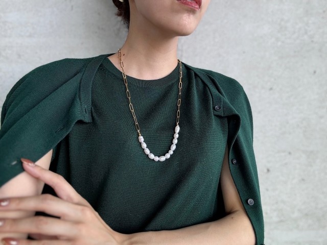 手持ちのセーターを上品に見せてくれるのが「パールネックレス」。シルバーチェーンとのコンビタイプや、Y字のロングパールネックレスを選ぶと普段使いしやすいですよ。着けるだけでコーデがサマに。