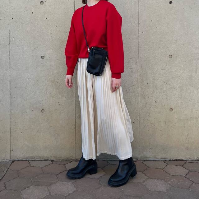 まずご紹介するのは、薄く繊細なスカートに暖かく見える暖色トップスを合わせたスタイル。スナップでは、冬コーデにぬくもり感をプラスできるレッドを取り入れています。トップスに暖色を合わせると、軽やかなスカートが冬仕様にまとまりますよ。