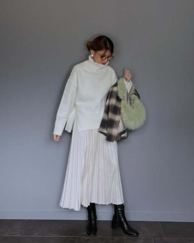 薄いスカートを使ったコーデに冬らしい素材を足して季節感を演出するのもおすすめの着こなしテクニック。例えばスナップでは、ファーバッグを合わせることで温かみのある冬っぽさ演出しています。他にもボアのストールやチェック柄のウールストールなども可愛く合わせることができますよ。