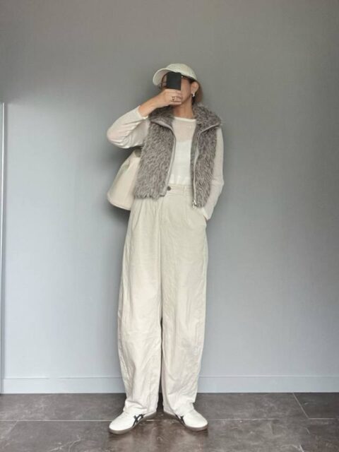 空港内のショッピングにも映えるホワイトのワントーンコーデ。ブラウンのファーベストで華やかさをプラスすれば、より上級者感漂うスタイルに。