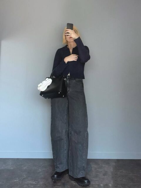 旅先でも大活躍するGU(ジーユー)「バレルレッグジーンズ」は、グレーを選ぶとより上品見え効果がアップ。ブラックのショート丈トップスとメリハリよくまとめてみましょう。