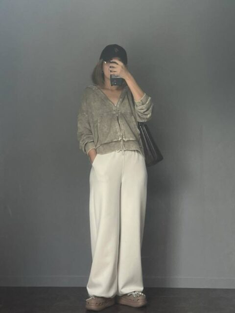 ウォッシュの利いたパーカーを合わせた上下スウェットコーデは、全体を優しいトーンでまとめると品よく仕上がります。