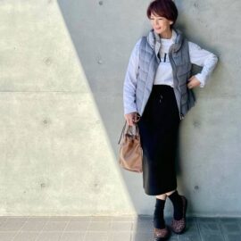 楽ちんなシルエットながらベーシックな大人っぽさがあるので、オーバーサイズのトップスを着るときにうってつけ。また収縮色である黒がダボッとしたニットを引き締めてくれ、50代らしい着こなしにまとまります。